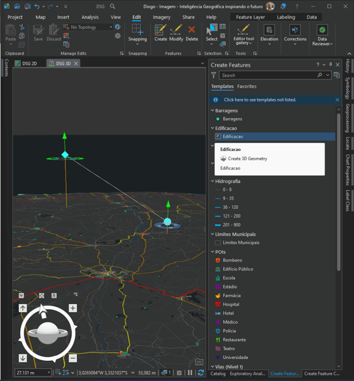 Agora vamos criar uma camada de objetos 3D em nosso geodatase, para simularmos o impedimento da visibilidade entre os dois pontos. Para isto, clique com o botão direito no File Geodatabase e selecione a opção Nova Classe de Feição (“New Feature Class“). Na lista de tipos de feição, selecione Objeto 3D (“3D Object“) e informe todas as propriedades da camada finalizando a criação. Vamos agora realizar a edição desta camada acrescentando um objeto 3D no trajeto da linha de visão.