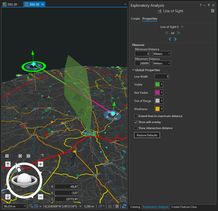 Após a criação do objeto 3D e configurando a distância do campo de visão entre os dois pontos para 200 km, verificamos que o objeto bloqueia a visibilidade, deixando a parte bloqueada do campo de visão destacada em vermelho, e o trecho visível em verde. Caso os pontos estejam posicionados acima da distância configurada, o trajeto será exibido em cinza.