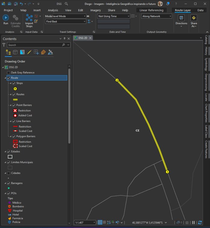 Um primeiro passo para entender os modelos de análise de rota é realizar dois tipos de análise, sendo a primeira a geração de uma Rota (“Route“) entre dois pontos e, a segunda, a análise de uma Área de Serviço (“Service Area“) a partir de um ponto. Ao selecionar a funcionalidade de rota, serão criadas camadas de paradas (“stops“), barreiras (“barriers“) e rota (“route“). A partir daí, você poderá editar a camada de paradas inserindo no mapa dois pontos. Ao selecionar a cama de rotas na lista de conteúdo, será habilitado o menu Camada de Rota (“Route Layer“) onde você poderá executar a análise de conectividade da rota entre os dois pontos, também conhecido como Trajeto (“Trace“).