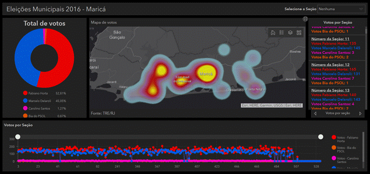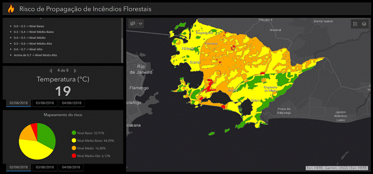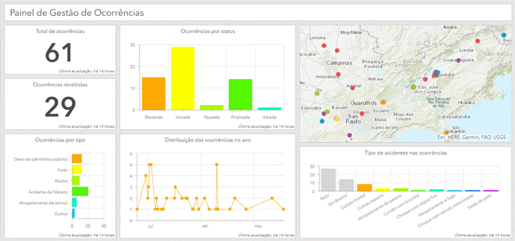 Com o objetivo de sistematizar uma grande quantidade de informações de forma fácil e intuitiva e, dessa forma, assegurar confiança na hora das instituições tomarem iniciativa em alguma ação, o ArcGIS Dashboards é uma aplicação online que colabora nesse sentido, através da construção de painéis inteligentes. Dentro deles, diversos elementos, como gráficos, mapas e tabelas podem ser inseridos de forma rápida e sem necessidade de programação.