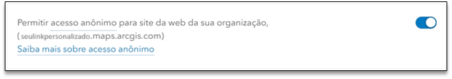- Permissão de acesso anônimo ao AGOL (ArcGIS Online): Habilita que a organização e seus produtos disponíveis de forma pública possam ser acessados pelo link do AGOL, exemplo: seulinkpersonalizado.maps.arcgis.com;