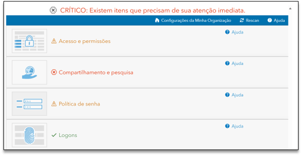 - ArcGIS Security Advisor: É possível ao administrador do sistema verificar itens de segurança recomendados e avaliados no aplicativo com apenas um clique. Examinar registros (logs), identificar erros, analisar pesquisas no Survey123 e itens compartilhados publicamente. Veja um exemplo de análise do orientador de configurações: