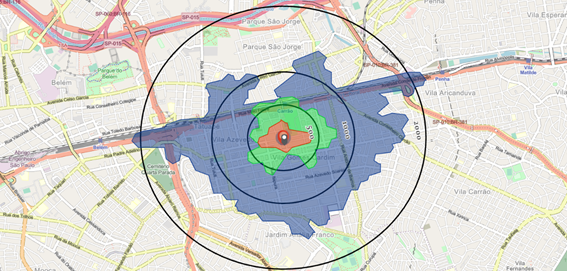 A seguir mostrarei um exemplo de área de influência de 1,2,5 minutos