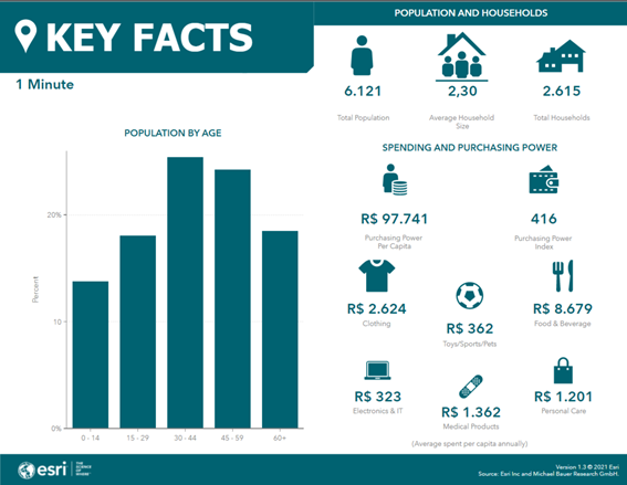 A seguir trago duas imagens com a espacialização do dado de renda, a localização dos concorrentes e um esquema de dados realizados a partir da área de serviço de 1 minuto gerada anteriormente e que nos apresentam dados sociodemográficos da região realizado com o Business Analyst.