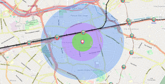 A seguir uma representação do mapeamento das estações de metrô em São Paulo. Na análise desse ponto é importante considerar as barreiras geográficas criadas pela linha do metrô, ou seja, a norte do ponto a área de influência pode ser impactada e o deslocamento dos clientes reduzido, como vemos na construção de área de influência acima: