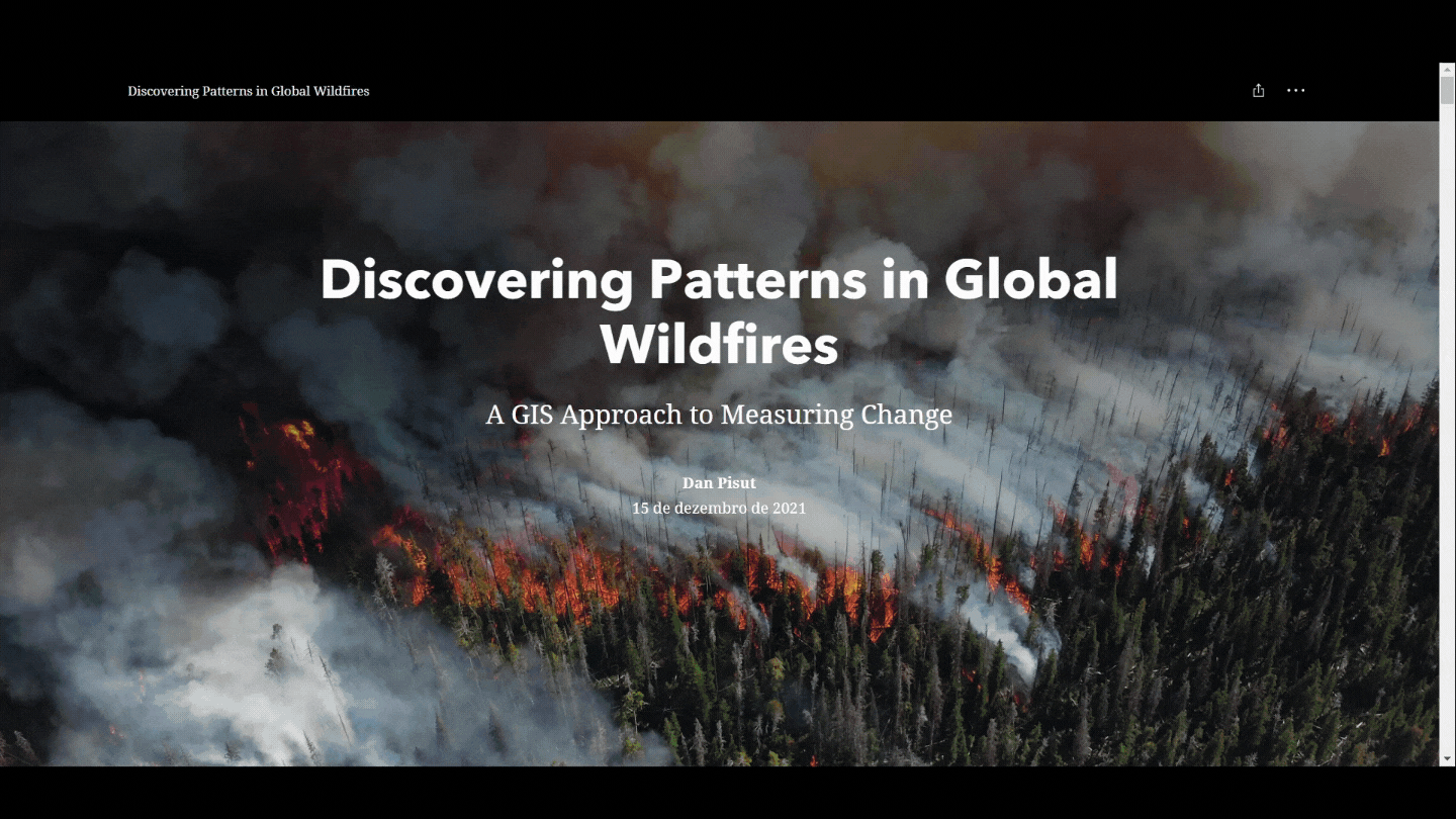 A análise de eventos ambientais é de grande importância, já que eles podem ocorrer em escala regional, nacional ou até mesmo mundial. Ao verificar a magnitude que um terremoto atingiu em diversos locais de uma região, ou estudar a dispersão de cinzas originárias de um vulcão em erupção, é interessante ter um mapa interativo acompanhado de uma seção descritiva para detalhar a situação de forma eficiente e conscientizar a população. Um ótimo exemplo de StoryMap que faz uso desses recursos é esse sobre padrões em incêndios florestais ao redor do mundo.
