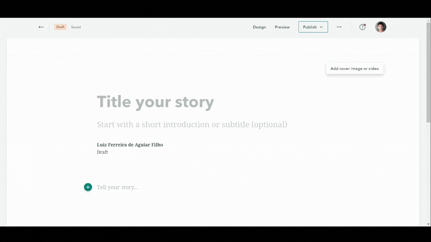 Ao clicar em “Nova história” e selecionar um dos modos, são apresentados o layout e sugestões para facilitar o início do seu projeto.