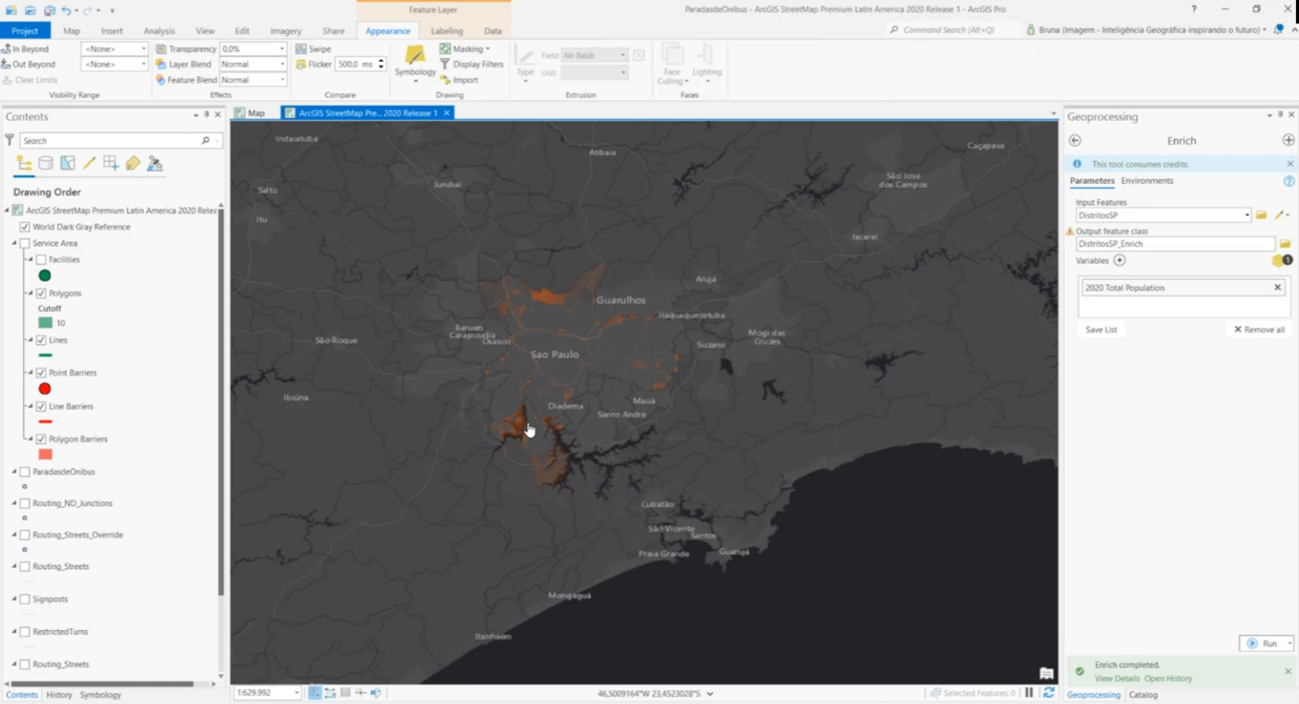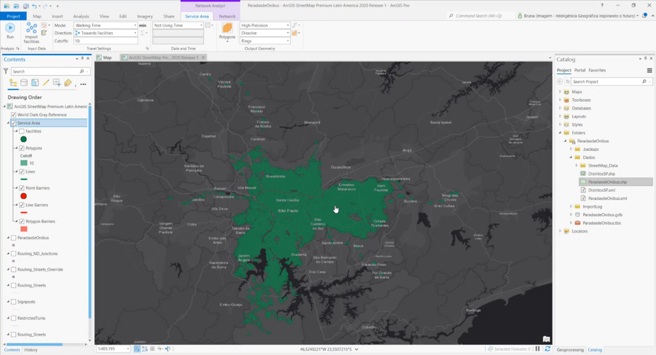 • Visualizar a região alcançável com a área do serviço: as áreas de serviço determinam um buffer de influência daquela localização em específico a partir de parâmetros pré-estabelecidos, como distância de condução, tempo de condução, distância de caminhamento, tempo de caminhamento, etc.