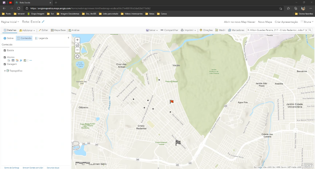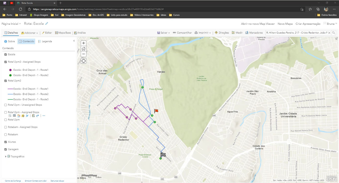 • Criar camadas para análise: Vamos imaginar que uma escola dispões do serviço de transporte dos seus alunos onde um ônibus vai buscar os alunos em suas residências pela manhã e os leva até a escola e ao fim das aulas por volta de meio dia pega os mesmos na escola e os leva até suas casas novamente. Então, de maneira bem similar ao Case #01 na etapa de ‘Visualização do serviço existente’, precisamos visualizar na tela os itens a serem analisados, nesse caso a Escola, a Garagem de onde o ônibus parti, e a Residência dos alunos, e é possível fazer isso, como já comentando, através de uma base de dados a qual você já tenha – shapefile de pontos, arquivo CAD, planilha de coordenadas –, através da coleta em campo com aplicativos mobile, ou ainda fazendo uso de ferramentas de geocodificação de endereços;