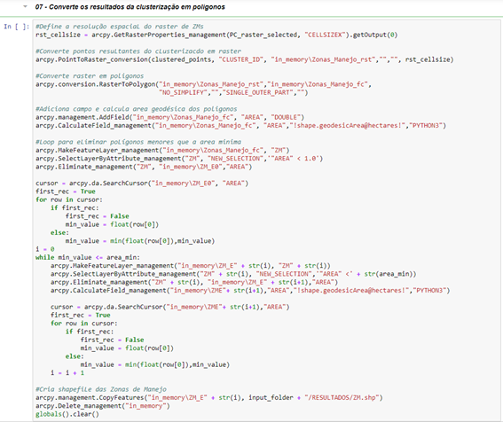 A sétima e última célula do notebook, contém o trecho do script que converte os pontos clusterizados em polígonos, executa uma “limpeza” dos polígonos com área inferior ao valor informado no parâmetro “área mínima” e por fim, limpa a pasta temporária e as varáveis criadas.