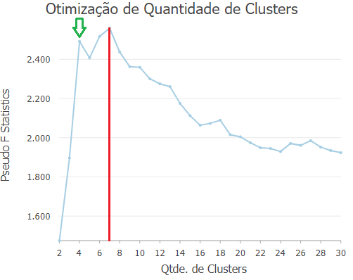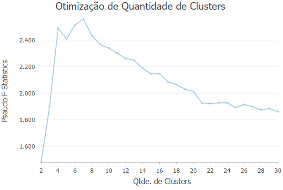 No caso do ArcGIS Pro, a ferramenta Multivariate Clustering permite gerar uma tabela com os valores da pseudo-estatística F para soluções com 2 a 30 clusters.