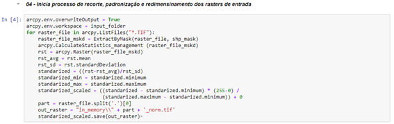 A quarta célula do notebook contém o trecho do script que realiza a padronização e redimensionamento das imagens raster de entrada.