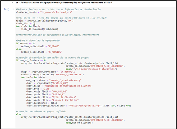 A sexta célula do notebook contém o trecho do script que executa o processo de clusterização dos pontos resultantes da ACP. No primeiro trecho de código da sexta célula, primeiramente são definidos alguns dos parâmetros da ferramenta de clusterização, em função de parâmetros informados na segunda célula do notebook e outros que dependem dos resultados da execução de células anteriores. Em seguida executa-se o algoritmo de clusterização em si.