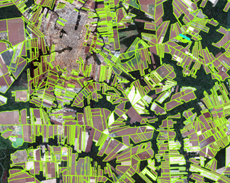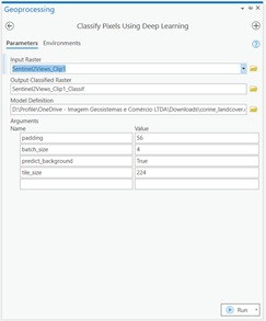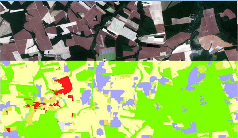 Utilizando do algoritmo de Deep Learning fornecido pelo Living Atlas da Esri (Land Cover Classification: Sentinel-2) com o ArcGis Pro, foi possível classificar os pixels de imagens do satélite Sentinel-2 (de mesma fonte) com alta resolução para obter várias classes de solo, dentre elas: áreas de plantio, rios, área urbana, entre outros.