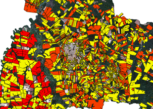 Na figura, as áreas com tom avermelhado, são as áreas que atingiram uma maior pontuação utilizando de critérios e pesos estabelecidos pela nossa equipe, mas que podem ser modificados e adaptados para qualquer realidade.