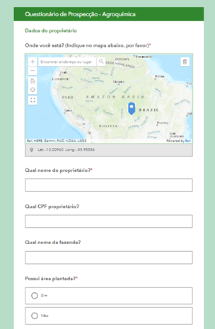 Como exemplo, pode-se enviar uma equipe de prospecção em campo para coletar informações especificas sobre o produtor e sua propriedade e plota-las no mapa. Veja imagem: