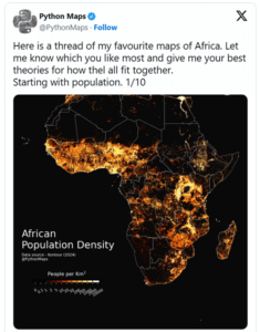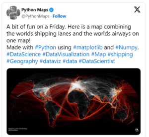 Adam Symington é um cientista de dados geoespaciais e cartógrafo baseado no Reino Unido. Um de seus projetos, PythonMaps, utiliza a linguagem de programação Python como uma tela cartográfica para destacar fatos e fenômenos ao redor do mundo. E eles fazem isso com elegância e arte.