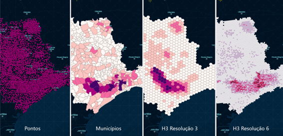 O H3 é uma ferramenta de indexação geoespacial criada pela Uber que permite a divisão de uma região geográfica em hexágonos, que podem ser de diferentes tamanhos, de acordo com a resolução escolhida. Projetado para ajudar a lidar com questões de pesquisa, visualização e análise de dados geoespaciais em grande escala, também pode ser uma ferramenta importante para trabalhar com alto volume de dados e o entendimento de sua granularidade, permitindo a realização de consultas espaciais de maneira mais eficiente do que os métodos tradicionais de indexação de dados.