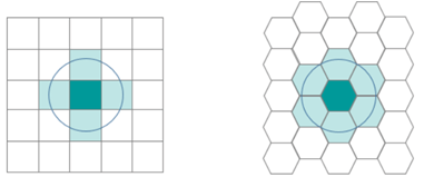 • Os hexágonos reduzem o viés de amostragem devido aos efeitos de borda da forma da grade, isso está relacionado à baixa relação perímetro-área da forma do hexágono. Um círculo tem a proporção mais baixa, mas não é possível organizá-los em formato de rede sem deixar lacunas.