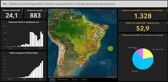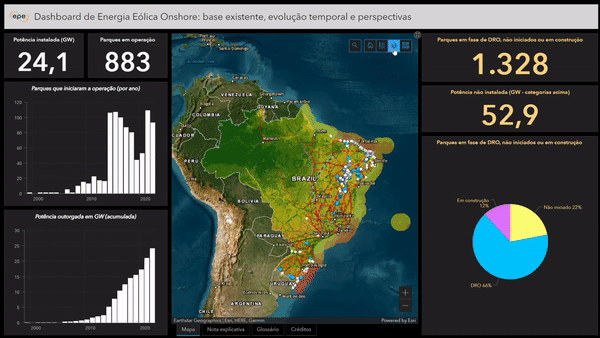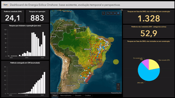 O Dashboard de Usinas Eólica Onshore, desenvolvido pela EPE, consiste em uma ferramenta de apoio a diversos usuários para fins de visualização e consultas acerca dos parques eólicos existentes no Brasil, bem como daqueles em perspectiva.