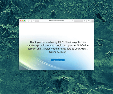 O Aplicativo de Transferência da Esri é uma nova ferramenta poderosa que permite que os usuários finais puxem o Insights da ICEYE diretamente para seus ambientes ArcGIS Online ou ArcGIS Enterprise com apenas alguns cliques. Quando um novo conjunto de dados do Insights estiver disponível, os usuários finais receberão um link, solicitando que eles entrem em sua conta do ArcGIS.