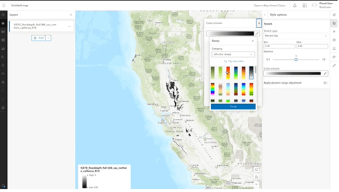 Os usuários finais ainda têm acesso às mesmas camadas, profundidade de inundação em uma camada de imagens lado a lado, extensão de inundação e notas de versão em camadas de feição hospedadas. O usuário final terá algumas ferramentas de análise espacial baseadas em vetores disponíveis para inspecionar a extensão da inundação, mas precisará do Processador Dedicado de Imagem habilitado para ter acesso às ferramentas de análise espacial raster para interrogar a profundidade da inundação para obter uma compreensão mais profunda do evento de inundação.